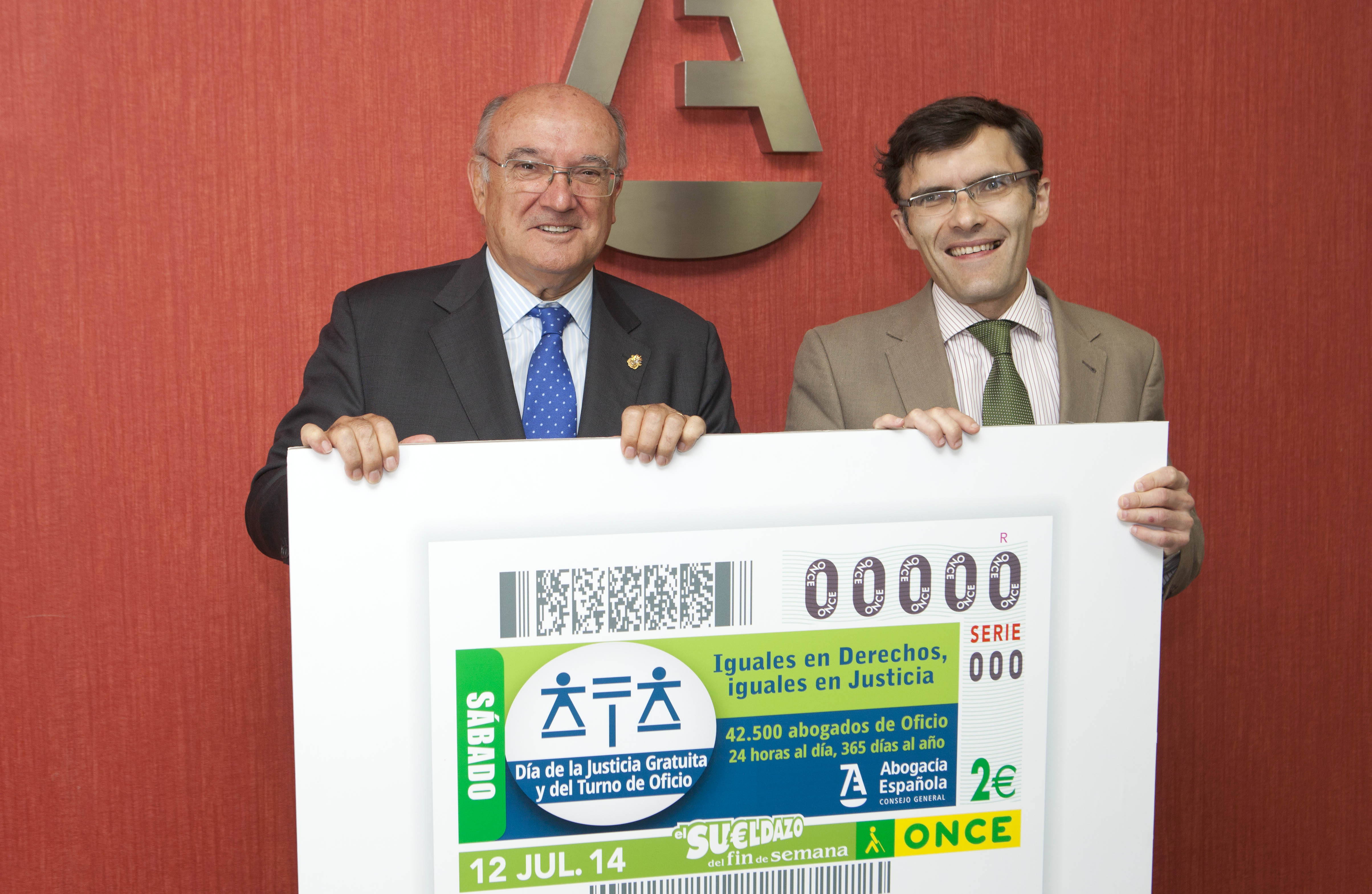 Alberto Durán, vicepresidente de la Fundación ONCE, y Carlos Carnicer, presidente del Consejo General de la Abogacía, han presentado esta mañana este cupón, que ya está a la venta. Esta es la segunda vez que la ONCE dedica su cupón a la Justicia Gratuita.