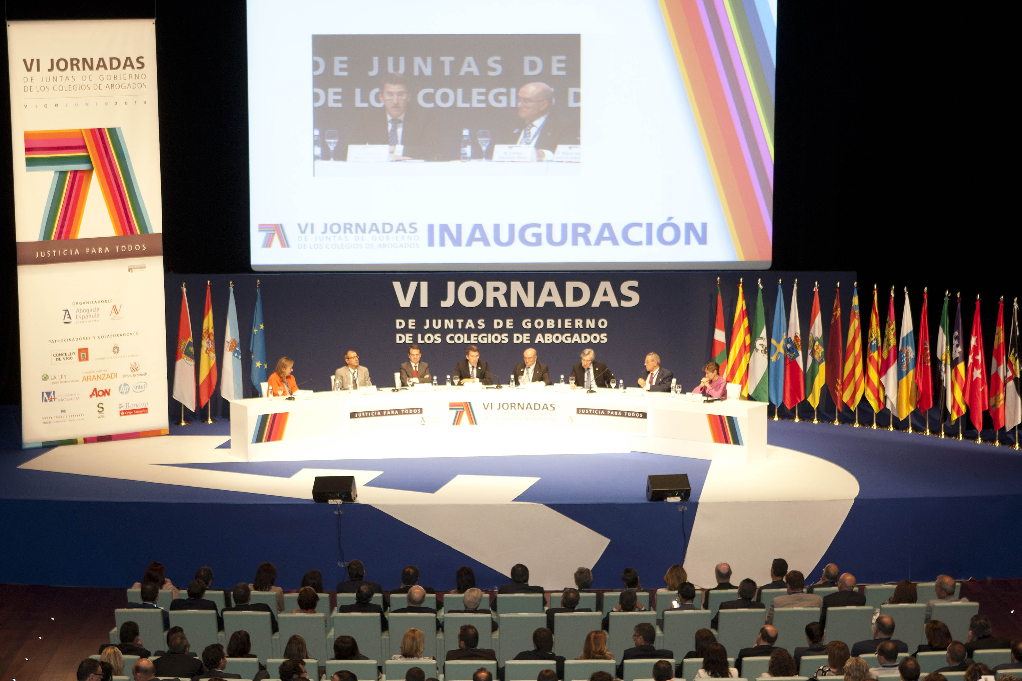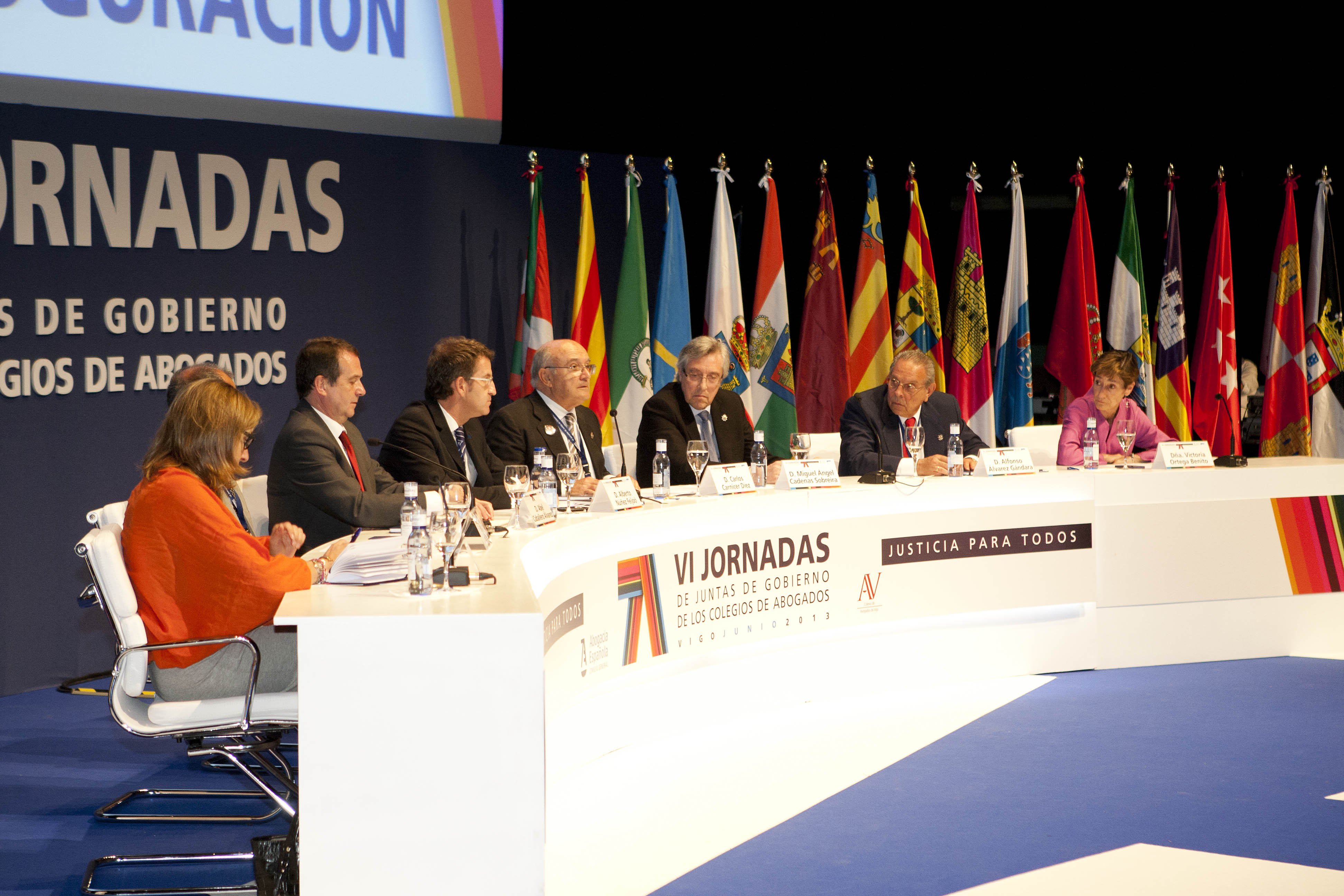 La Ley de Servicios Profesionales y el último borrador filtrado sobre la futura Ley de Colegios Profesionales, que ahora parece que se aprobará como una legislación aparte, marcaron el inicio de las VI Jornadas de Juntas de Gobierno que se celebran en Vigo los días 27 y 28 de junio, y que fueron inauguradas este jueves por el presidente del Consejo General de la Abogacía, Carlos Carnicer, el presidente de la Xunta de Galicia, Alberto Núñez Feijóo, acompañados por el alcalde de Vigo, Abel Caballero, el presidente del TSJ de Galicia, Miguel Ángel Cadenas, el presidente en funciones del Consello de la Avogacia Galega, Arturo González Estévez –en sustitución del presidente y decano de A Coruña, Antonio Platas, por razones de salud, y para el que todos los asistentes tuvieron un cariñoso recuerdo-, y el decano del Colegio de Abogados de Vigo, Alfonso Álvarez Gándara.