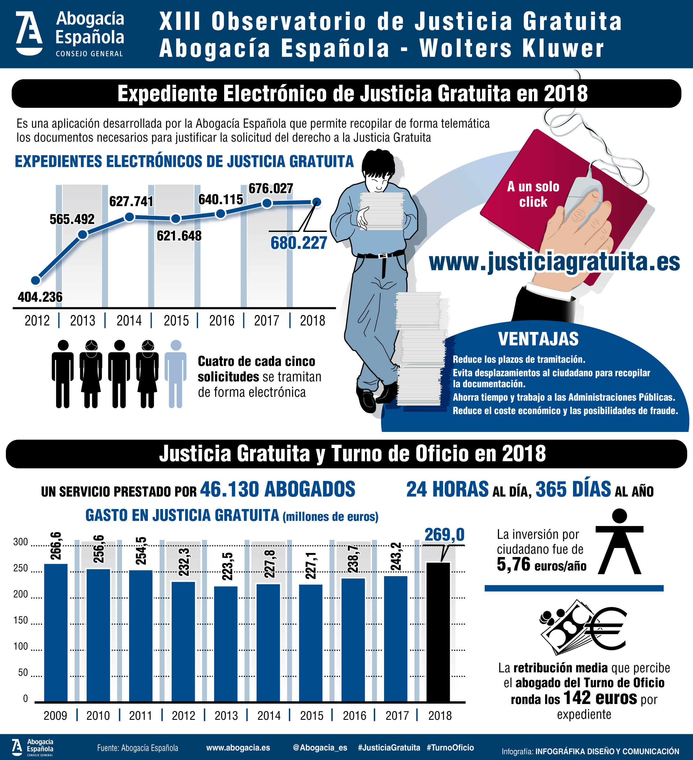 La inversión total destinada por las distintas Administraciones Públicas a la Asistencia Jurídica Gratuita en España ha alcanzado durante 2018 los 269 millones de euros, lo que supone un incremento del 10,6% con respecto a 2017, cuando se invirtieron 243,2 millones de euros en este servicio que es imprescindible para la defensa de los derechos de los ciudadanos.