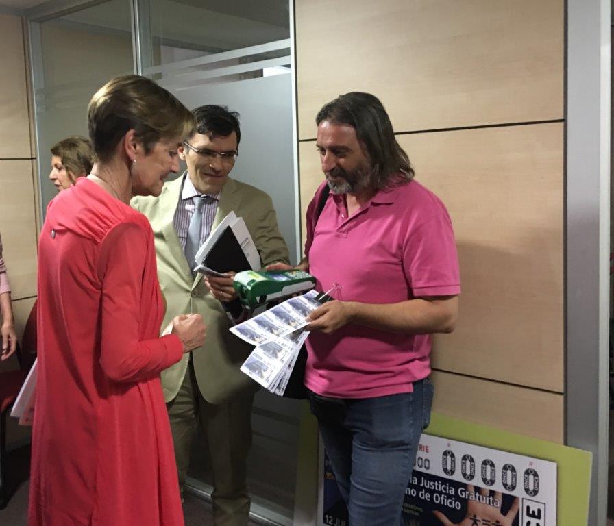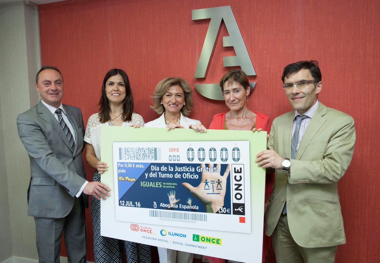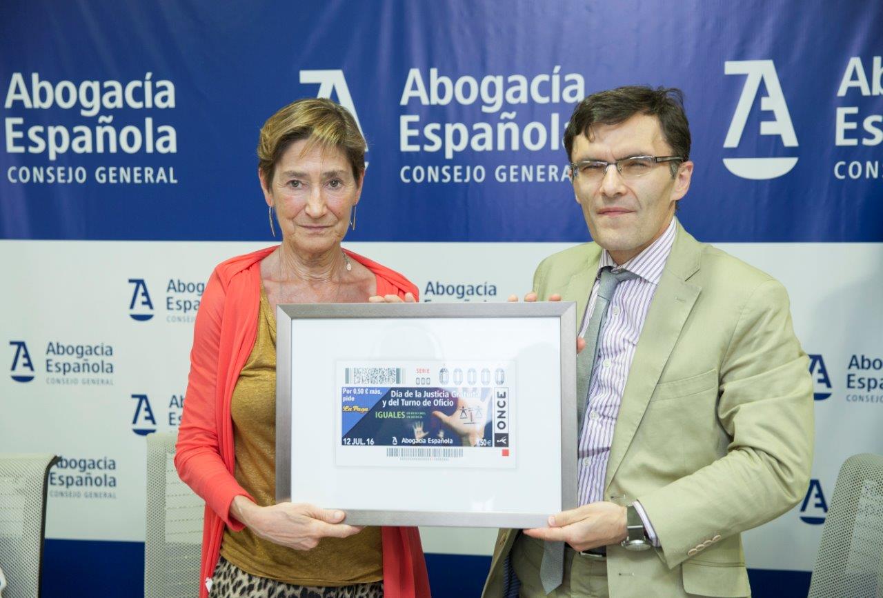 Durante la rueda de prensa, la presidenta de la Abogacía Española y el vicepresidente ejecutivo de la Fundación ONCE, Alberto Durán, presentaron el cupón de la ONCE del martes 12 de julio que conmemorará el Día de la Justicia Gratuita y del Turno de Oficio. Durán ha asegurado que es «un orgullo que el 12 de julio haya 12 millones de cupones para poner en alza el valor de la Justicia Gratuita».