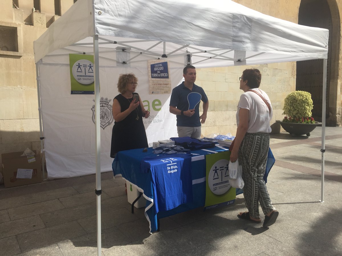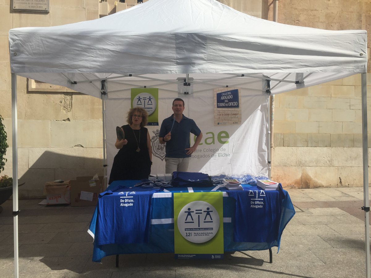 El Colegio de Abogados de Elche, con motivo de la celebración del Día de la Justicia Gratuita organizó una jornada de puertas abiertas en la sede principal, así como la colocación de una mesa informativa en la Plaça Baix de 9:30 horas a las 12 horas, para repartir folletos informativos y recuerdos de la conmemoración. Como clausura al acto se hizo entrega a Mª. de los Angeles Sánchez-Rojas Serrano y Salvador Soler Campos de los diplomas distintivos por su aportación profesional a la Justicia Gratuita.