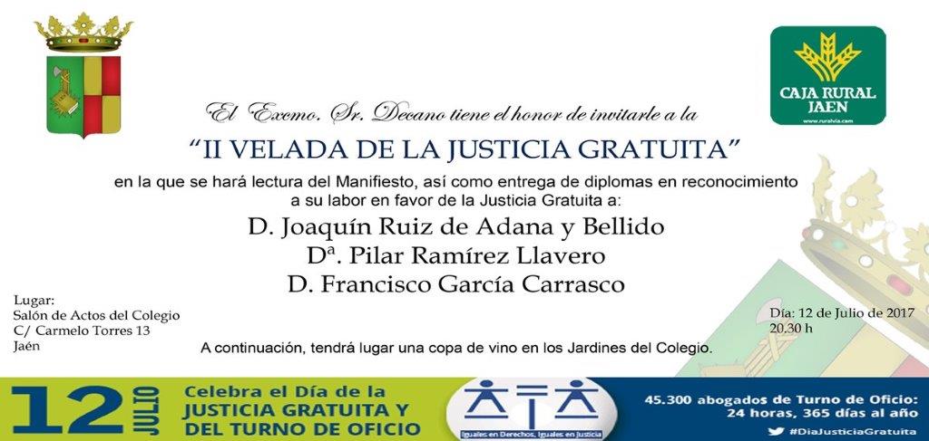 El Colegio de Abogados de Jaén organizó la II Velada de la Justicia Gratuita el 12 de julio a las 20:30 horas, en la que se leyó el Manifiesto y se entregaron diplomas en reconocimiento a su labor en favor de la Justicia Gratuita a Joaquín Ruiz de Adana y Bellido, Pilar Ramírez Llavero y Francisco García Carrasco.