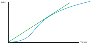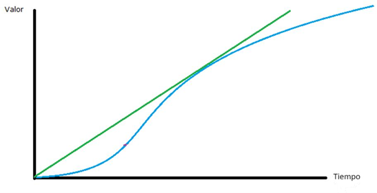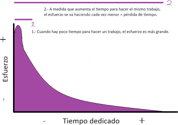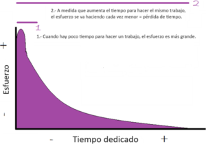 Este concepto se ilustra a través del siguiente gráfico, donde la curva verde representa la relación entre el tiempo invertido y la calidad del trabajo realizado: