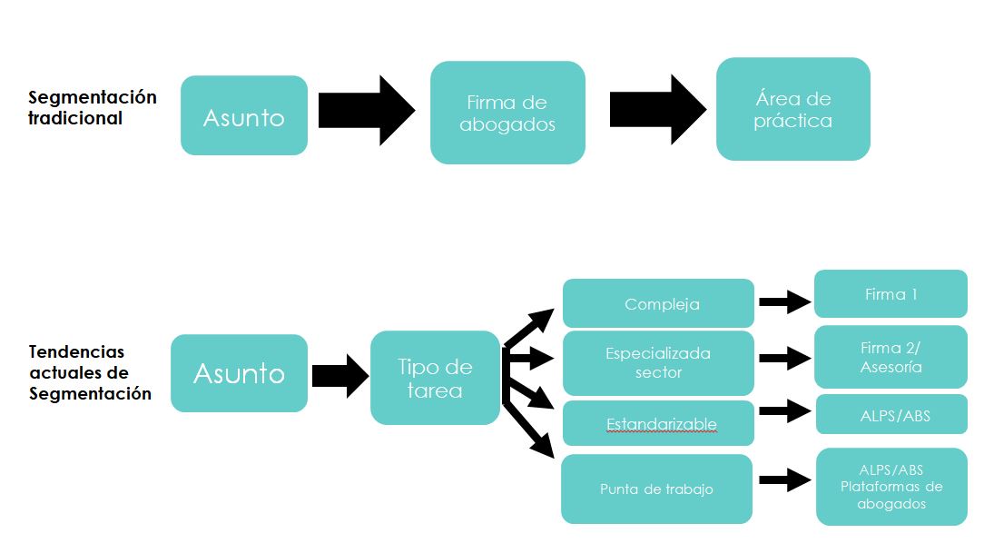 El modelo tradicional de firma de abogados es uno de los modelos de servicios profesionales que ha perdurado durante los años y que ha mantenido ese carácter artesanal de maestro–aprendiz. Este modelo, desde luego, sigue siendo válido, pero han llegado al sector nuevos modelos y formas diferentes de prestar servicios jurídicos que han supuesto una disrupción en el sector y que compiten con las firmas tradicionales en determinados segmentos del mercado. Los clientes que han buscado abogados tradicionalmente en función de la especialidad técnica, empiezan a entender que diferentes modelos prestan diferentes tipos de servicios. La segmentación deja de ser por área de práctica y el cliente valora la especialidad sectorial y en especial el tipo de trabajo que requieren. Cada trabajo puede tener una parte estandarizable y otra parte de valor añadido y no necesariamente requieren el mismo tipo de proveedor. Este tipo de segmentación genera un mercado diferente con diferentes jugadores que no compiten por la misma tipología de trabajo. Esto implica diferentes rentabilidades de negocio, diferentes tipos de talento, diferentes inversiones en tecnología y sobre todo cubren diferentes necesidades de clientes.