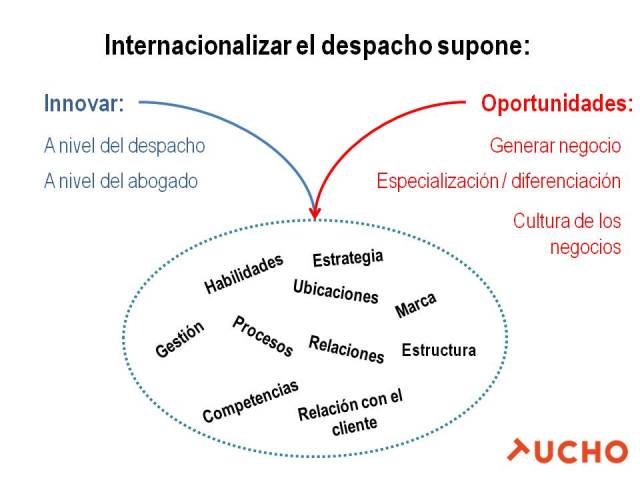 Acerca del otro mantra, el relacionado con la innovación: innovar es hacer las cosas de una manera diferente a la que las hacíamos. Eso, sin duda, va a ser así cuando la firma salga fuera, incluso en los casos de “internacionalización débil” –por ejemplo, cuando sólo he llegado a un acuerdo de best friends con otro despacho-. Así que, aunque no hablemos de una innovación disruptiva, el despacho va a tener necesidad de innovar… y mucho, si quiere que el proceso de salida al exterior sea un éxito.