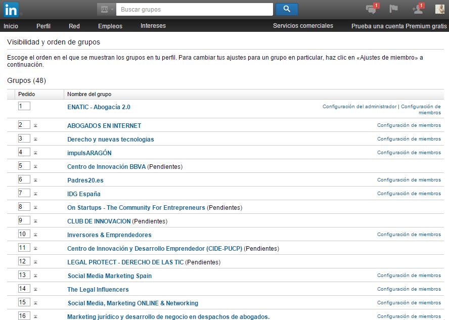 Si haces click en la rueda de configuración de la derecha del cuadro amarillo de “Échale un vistazo” podrás configurar el orden en el que aparecen los grupos en los que participas, de cara a facilitarte tu acceso por orden de prioridad.