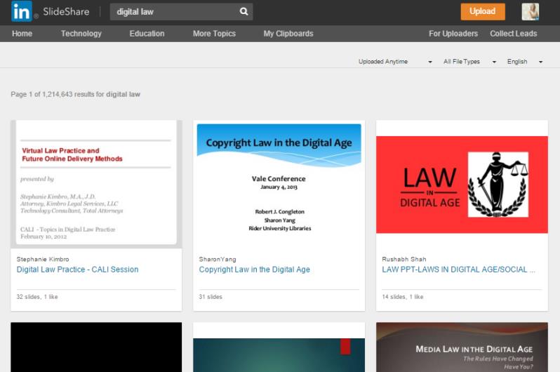Para publicar tus contenidos en SlideShare accedemos a SlideShare a través de LinkedIn en la pestaña “Intereses”. Hacemos click en SlideShare y nos redirige al muro de esta red, donde podemos ver las presentaciones de modos diversos, incluido por temáticas, así como hacer búsquedas en el cuadro de búsquedas superior por temáticas.