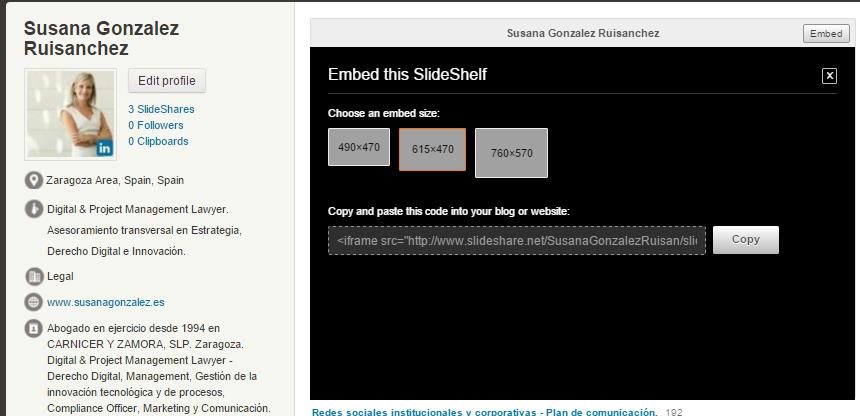 De hecho incluso podemos subir una presentación a SlideShare y embeberla en un post en nuestra web o blog con la generación del código de inserción:
