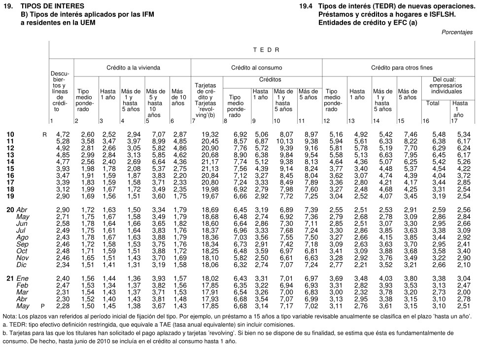 1. Para identificar cuál es el interés normal de mercado para las tarjetas revolving contratadas en la primera década de este siglo, como regla general ha de acudirse a la información específica más próxima en el tiempo, que es la desglosada por el Banco de España en 2010 y que el TS fija en el tipo medio del 19,32%.