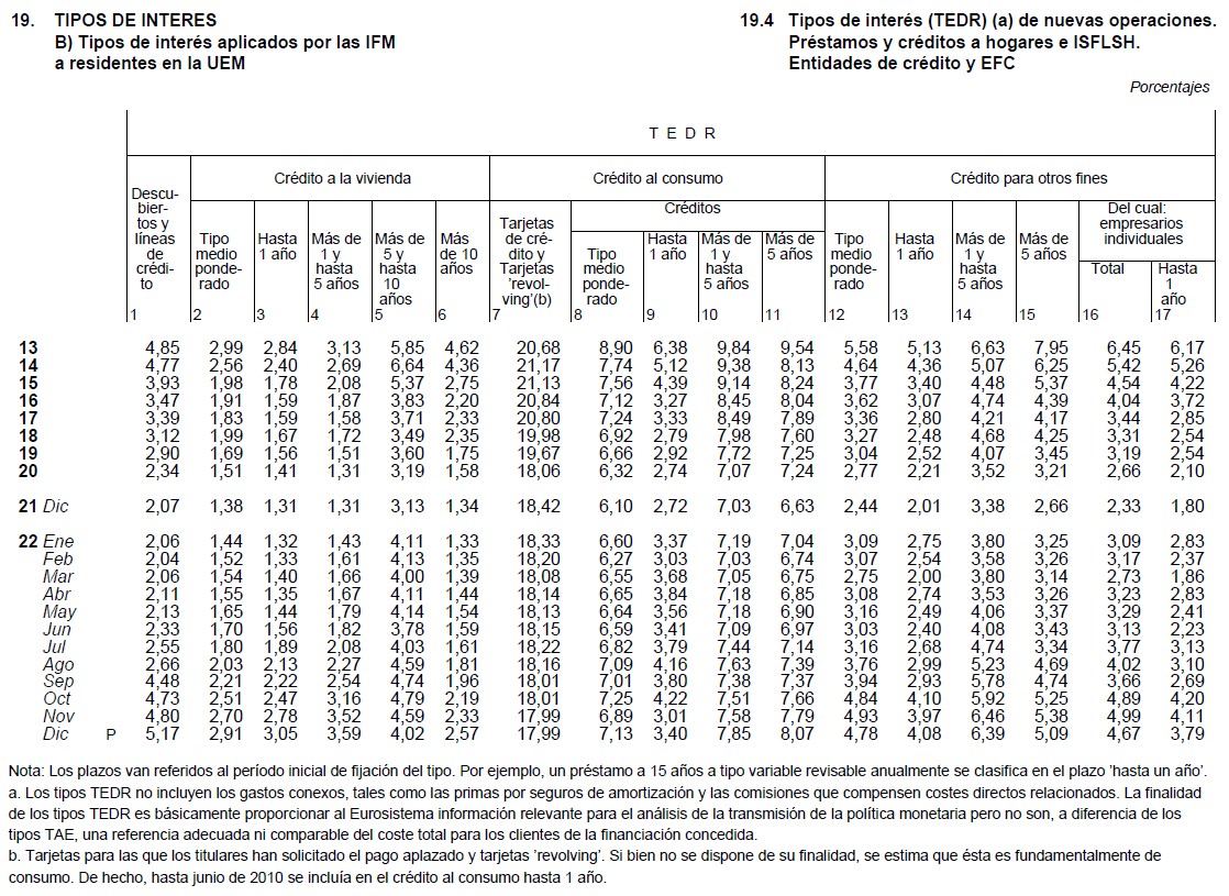 Como se puede ver en las dos capturas de pantalla que se facilitan, extraídas de la página Web del Banco de España y correspondiente al Capítulo 19,4 del Boletín Estadístico del Banco de España https://www.bde.es/webbde/es/estadis/infoest/temas/sb_tiif.html, se dispone de los tipos medios de los intereses desde el año 2010, en columnas separadas, tanto de los créditos revolving, como del resto de créditos al consumo.