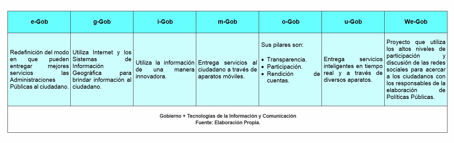 Las generaciones futuras estarán habituados a escuchar términos como e-Gob, g-Gob, m-Gob, o–Gob, p-Gob, u-Gob, we-Gob, aunque posiblemente el uso de estas palabras será desplazado en unos años. No obstante, a nosotros aún no nos han quedado muy claras las ideas y necesitamos realizar un breve análisis de esos conceptos.