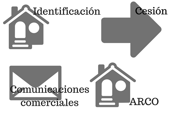 En relación con este último punto, en las políticas de privacidad podríamos resumir los cuatro pilares básicos (identidad del titular, finalidad del uso, cesión a terceros, ejercicio de los derechos ARCO) con unos simples iconos que permitan al usuario identificar a primera vista la información necesaria. A modo de ejemplo podríamos utilizar los siguientes símbolos: