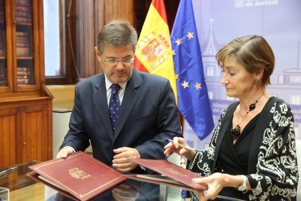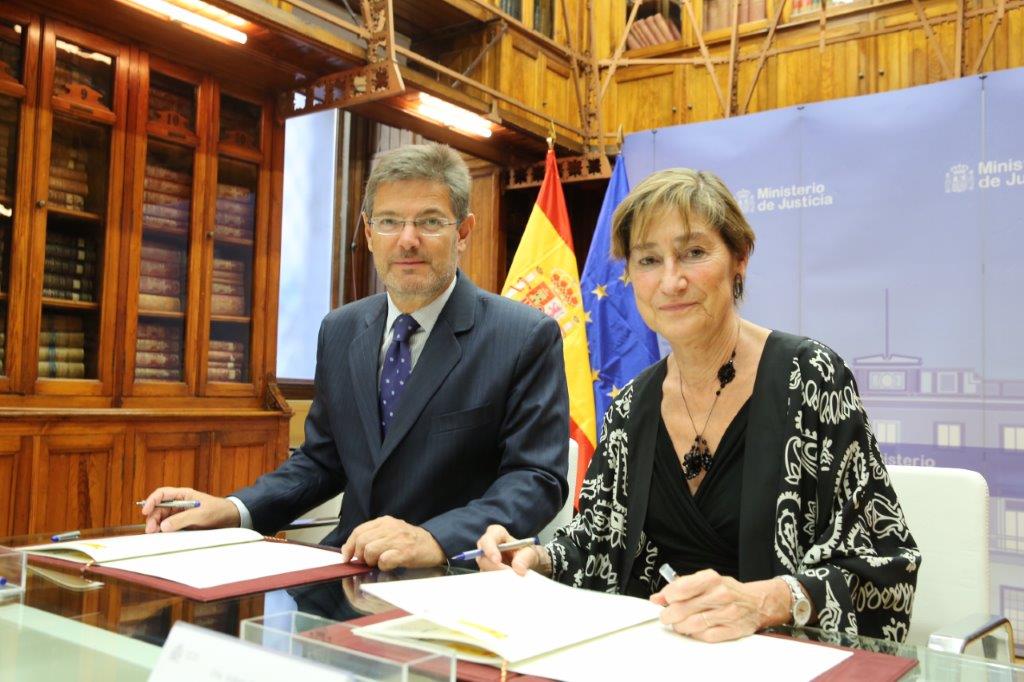La presidenta del Consejo General de la Abogacía Española, Victoria Ortega, y el ministro de Justicia, Rafael Catalá, han firmado el martes 25 de julio el Convenio suscrito entre ambas instituciones para habilitar que los abogados puedan presentar electrónicamente las solicitudes de nacionalidad española por residencia en representación de los interesados.