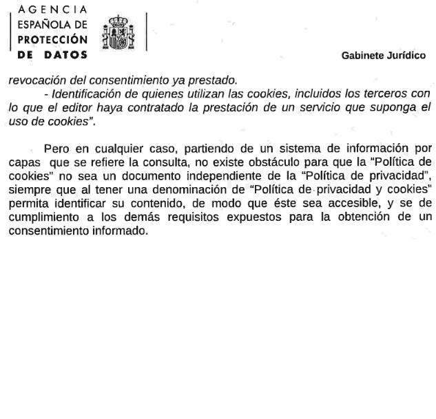 Por lo tanto, siempre que la “Política de privacidad y cookies” contenga la información mínima necesaria sobre el uso de las cookies, y como se podrá observar en la imagen que acompaña el presente artículo, el Informe indica claramente que “[…] no existe obstáculo para que la “Política de cookies” no sea un documento independiente de la “Política de privacidad”, siempre que al tener una denominación de “Política de privacidad y cookies” permita identificar su contenido, de modo que éste sea accesible, y se de cumplimiento a los demás requisitos para la obtención de un consentimiento informado.”