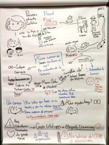 Poco a poco fuimos avanzando por las fases de diseño, prototipado y testeo con usuarios teniendo en cuenta que no necesitaban soluciones tecnológicas glamourosas sino algo práctico que pudiera enviarse al whatsapp (que era el canal más utilizado). Todo ello lo fuimos trabajando conjuntamente en la plataforma que generó Macarena donde compilamos la información.