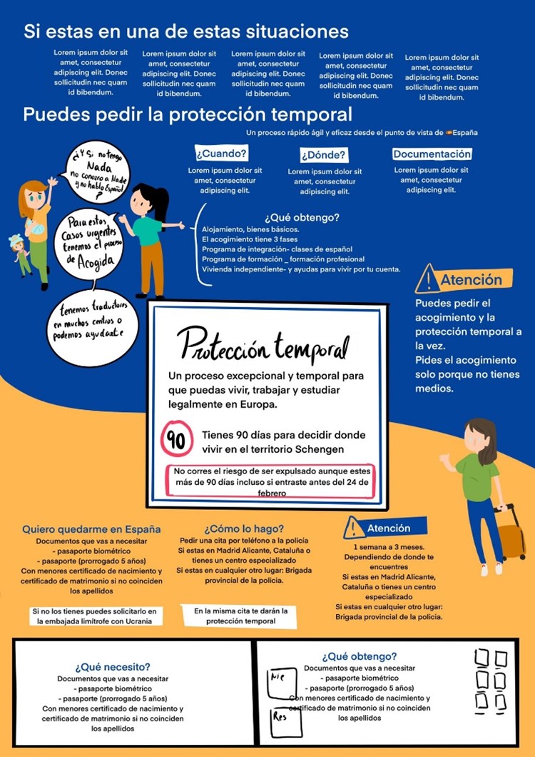 Como primer resultado obtuvimos la siguiente infografía (a modo de Producto mínimo viable) que resumía no sólo la guía sino toda la información encontrada en otras fuentes concentrándonos en explicar el sistema de Protección Temporal y el sistema de acogida.
