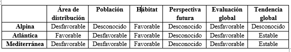 7. En un trabajo publicado en 2021 (4), quien escribe esto ya expuso los datos que se desprendían de los informes de la Comisión Europea a través de EIONET (5), esto es, la red europea de información y de observación sobre el medio ambiente, que surge de la colaboración de la Agencia Europea de Medio Ambiente, los 27 Estados miembros de la UE, Islandia, Liechtenstein, Noruega, Suiza, y Turquía, más 6 Estados colaboradores: Albania, Bosnia y Herzegovina, Macedonia del Norte, Montenegro, Serbia y Kosovo. A estos datos se remite la Comisión Europea en su página de Internet cuando hace referencia a los informes de aplicación de la Directiva de Hábitats, bajo su art. 17. Pues bien, de acuerdo con la información accesible en EIONET sobre el periodo 2013-2018, para las tres regiones biogeográficas que ocupa el lobo en España, es decir la Alpina, Atlántica y Mediterránea, el estatus de los diferentes criterios de evaluación se resumía de la siguiente manera: