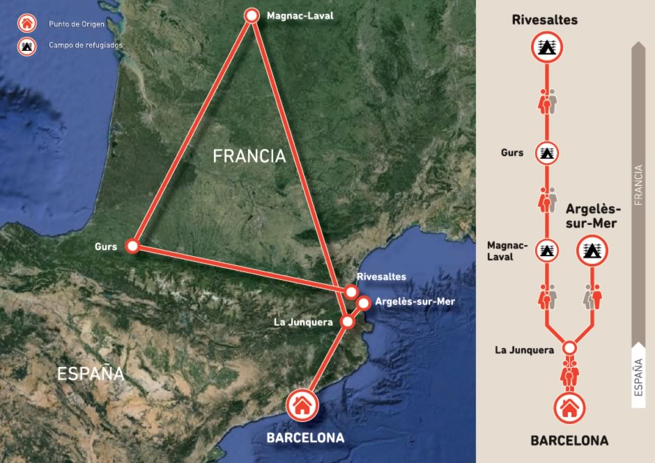 Yo salí de España cruzando los Pirineos en enero de 1939. Recuerdo que mi padre se agachó y cogió un puñado de tierra que se guardó en el bolsillo derecho de la chaqueta, y que se le fue perdiendo por el camino porque el bolsillo estaba desfondado. Los moros que nos esperaban nos trataron como si fuéramos negros. A nuestro lado iba otra familia también sin madre que había muerto, igual que la mía, en un bombardeo. El padre se llamaba Amadeo Gracia y tenía una pata de palo, como los piratas. Llevaba a su hija a hombros, porque no podía andar, ya que le faltaba también una pierna. Cuando tuvimos que acelerar el paso, les dejamos atrás porque no nos podían seguir. Ya no les vimos más. Esa noche dormimos tapados por una lona, y comimos algunas sardinas que nos dieron los moros. Luego estuvimos varios meses yendo de un campo de concentración a otro. Comimos muy mal y dormimos peor. Ahora, cuando han pasado tantos años, pienso que mi padre tenía razón cuando decía que la culpa era nuestra por haber nacido pobres, y en un mal sitio. Como tantos españoles, que hemos sido emigrantes y refugiados.